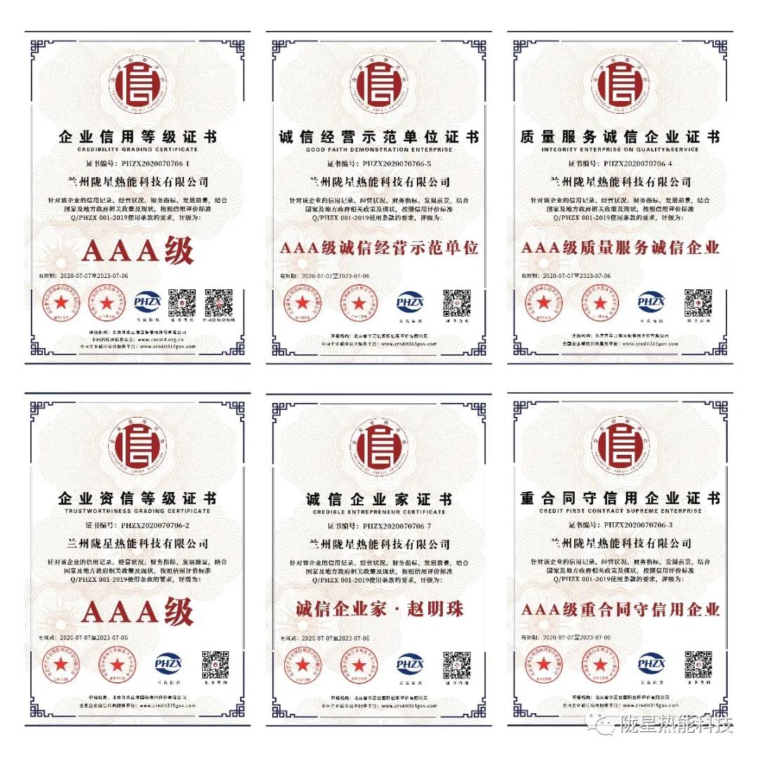 7月7日,北京華普正信國際信用評價有限公司和全國企業誠信公共服務平臺結合國家及地方相關政策及現狀,按照信用評價相關標準,蘭州隴星熱能科技有限公司通過AAA級企業信用等級、AAA級企業資信等級、AAA級誠信供應商、AAA級重合同守信用企業、AAA級誠信經營示范單位、AAA級質量服務誠信企業的評級認定,趙明珠總經理被評為誠信企業家,所有評價信息均已在中國招投標網和全國企業誠信公共服務平臺進行公示。