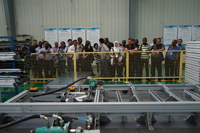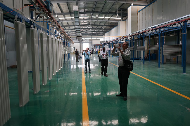 在集團公司總裁吳繼祖陪同下,參觀團先后深入到廠房和制造車間,對生產環境、工藝流程、主要設備、人員配備情況等進行了參觀和了解。參觀團一行對我公司新研發的輕型散熱器、平板集熱器、熱電聯產、PIC抑制熱傳導生產線等進行了現場觀摩。他們在全方位了解公司的規模實力、研發實力及詳細的產品介紹后,高度贊揚了公司產品的質量和創新研發能力,對我公司的產品產生較大的興趣并期望今后與我公司能有合作機會。