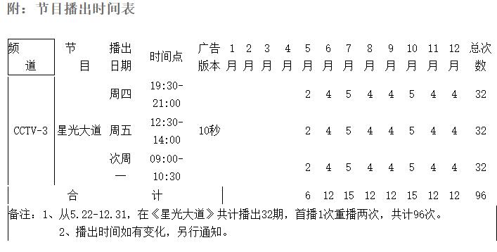 在“隴星”商標榮獲中國馳名商標之際,為了進一步提升隴星品牌形象,經集團公司與央視代理媒體共同努力,并通過中央電視廣告管理中心的核準,“隴星”品牌正式成為央視上榜品牌和CCTV-3綜藝欄目《星光大道》合作企業,雙方商定自2014年5月22日至12月31日,在CCTV-3每期星光大道節目中插播隴星10秒電視廣告,每周首播一次,重播兩次,共計播出96次。并在CCTV-2《中國財經報道》欄目加播一月共4次(時間另定)